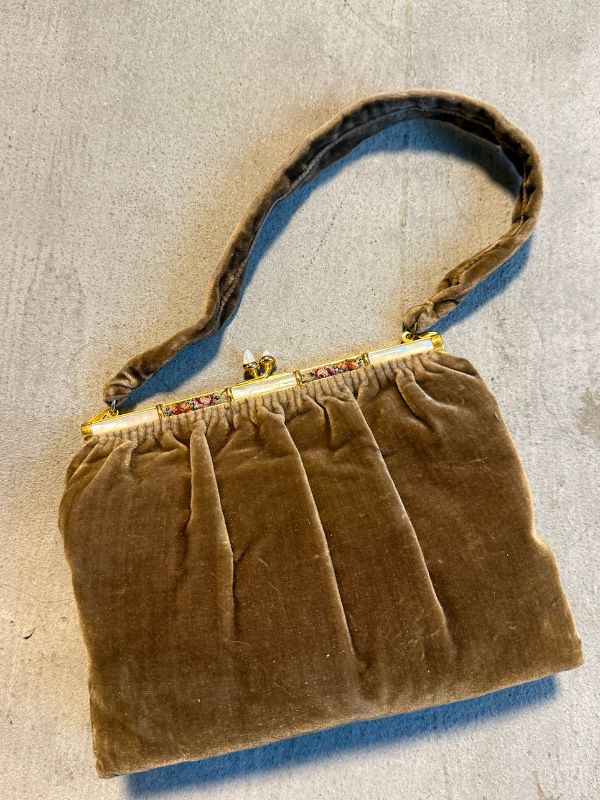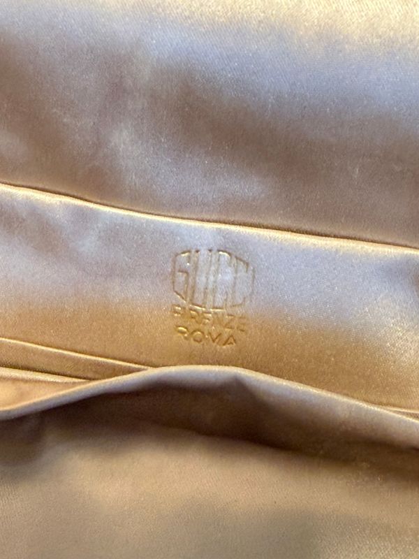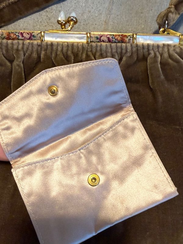 Pochette vintage Gucci anni ‘50 in velluto marrone e chiusura gioiello, interno in seta color cipria con portamonete